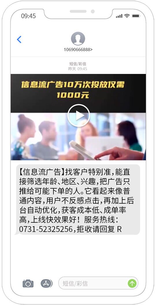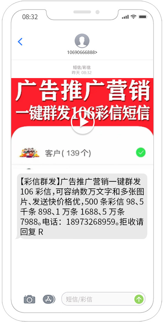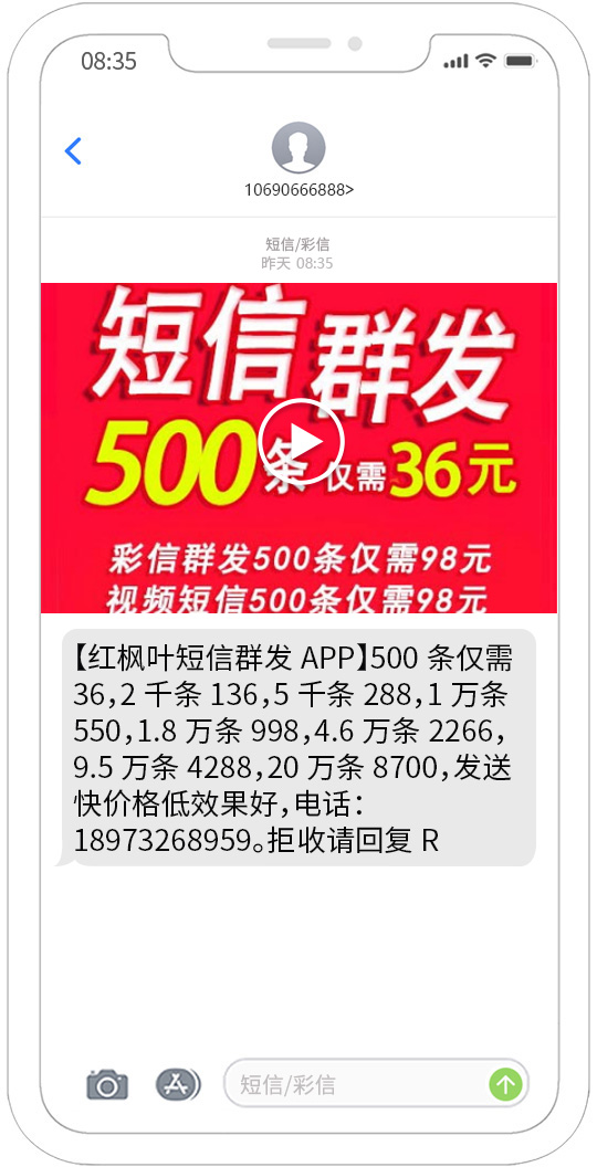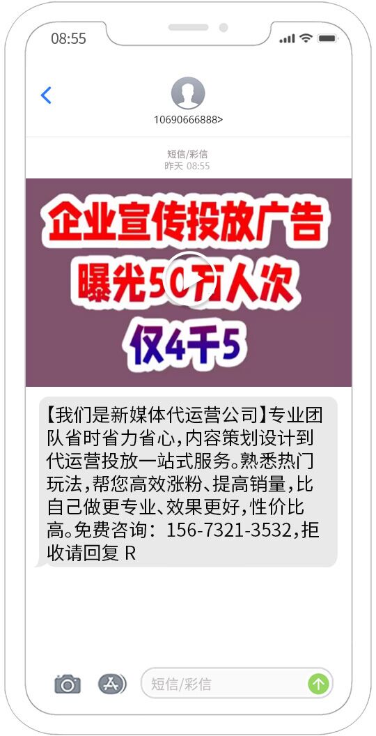 視頻短信發(fā)送能夠覆蓋移動、聯(lián)通、電信用戶,正規(guī)集團視頻短信通道,快速、可靠、穩(wěn)定、形象好,能快速將您的訊息投放到用戶的手機。